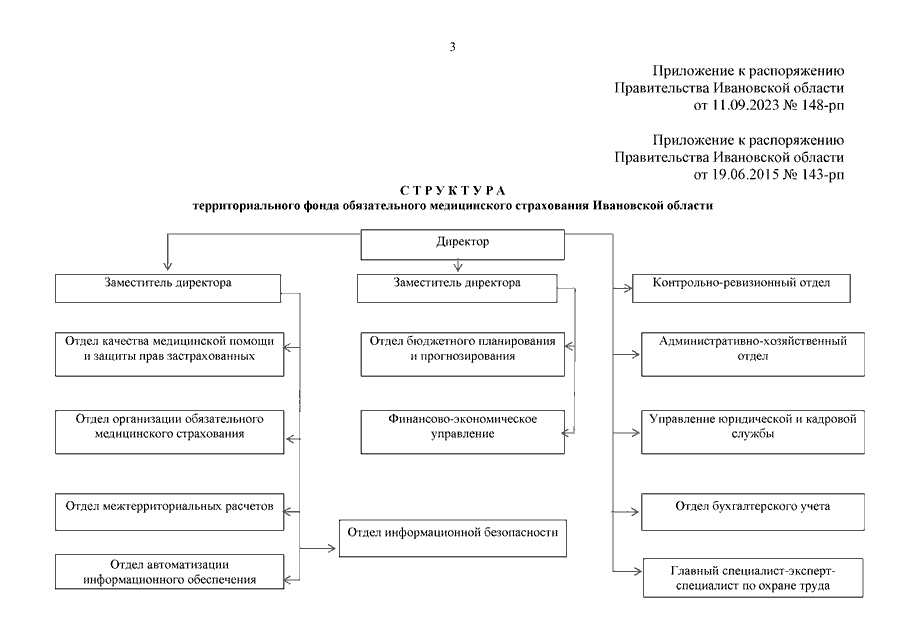 Распоряжение Правительства Ивановской области от 11.09.2023 N 148-рп "О внесении изменений в распоряжение Правительства Ивановской области от 19.06.2015 N 143-рп "Об утверждении структуры, предельной численности и фонда оплаты труда территориального фонда обязательного медицинского страхования Ивановской области"