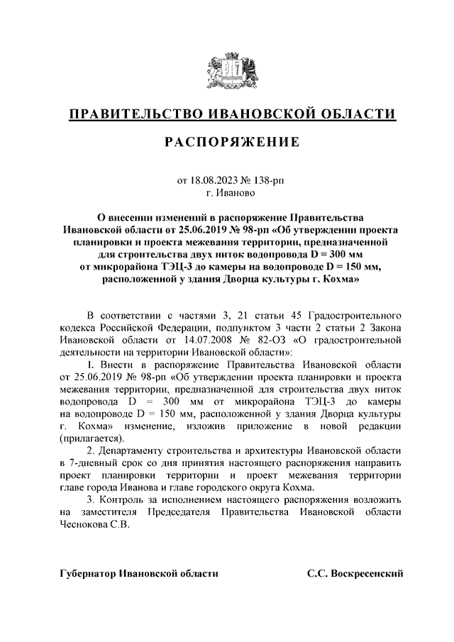 Распоряжение Правительства Ивановской области от 18.08.2023 N 138-рп "О внесении изменений в распоряжение Правительства Ивановской области от 25.06.2019 N 98-рп "Об утверждении проекта планировки и проекта межевания территории, предназначенной для строительства двух ниток водопровода D = 300 мм от микрорайона ТЭЦ-3 до камеры на водопроводе D = 150 мм, расположенной у здания Дворца культуры г. Кохма"