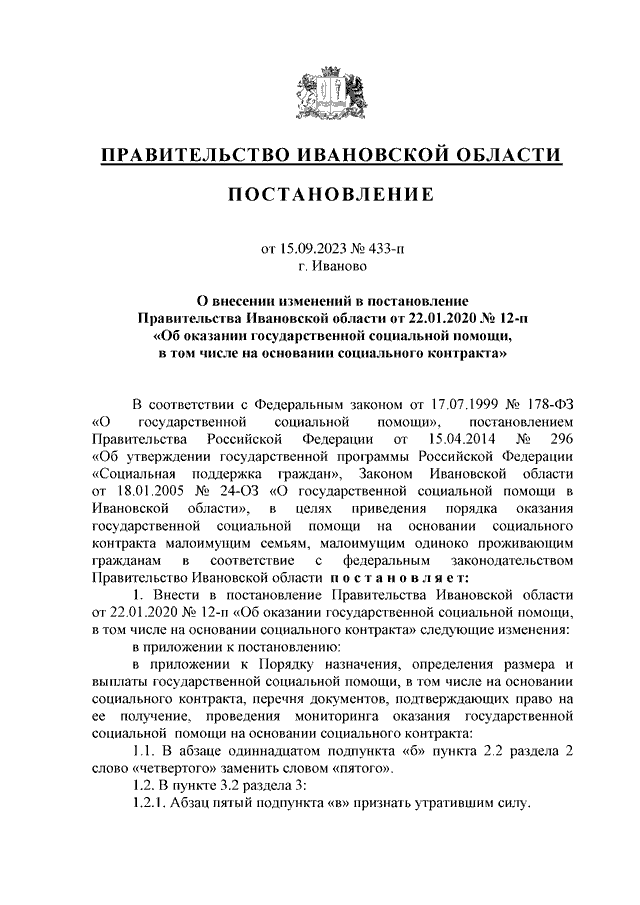 Постановление Правительства Ивановской области от 15.09.2023 N 433-п "О внесении изменений в постановление Правительства Ивановской области от 22.01.2020 N 12-п "Об оказании государственной социальной помощи, в том числе на основании социального контракта"