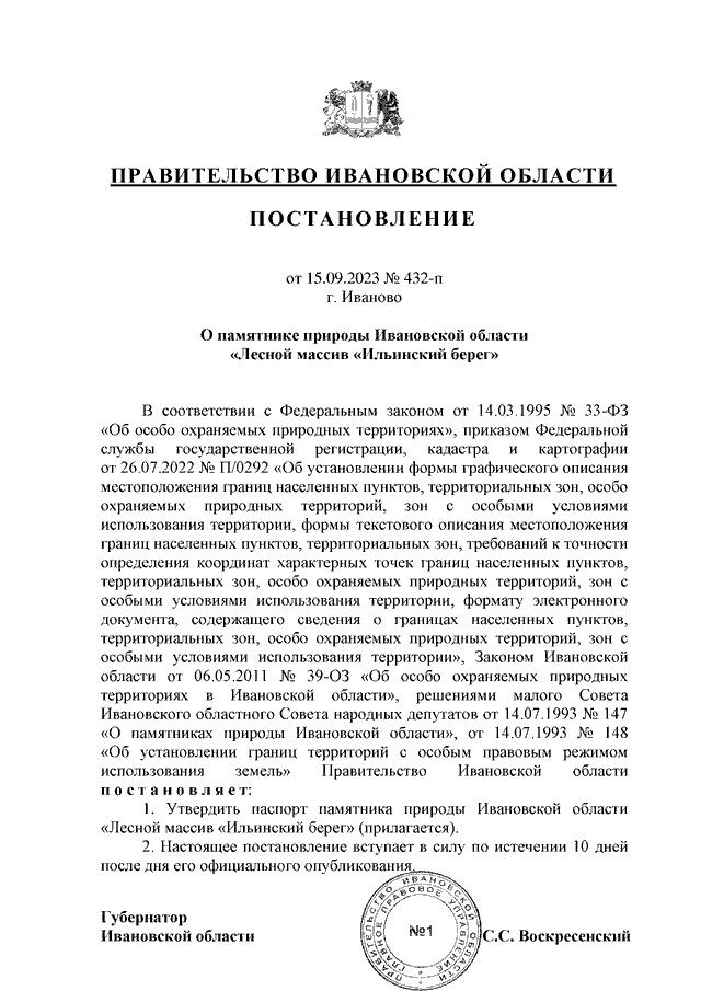 Постановление Правительства Ивановской области от 15.09.2023 N 432-п "О памятнике природы Ивановской области "Лесной массив "Ильинский берег" (вместе с "Паспортом памятника природы Ивановской области "Лесной массив "Ильинский берег")