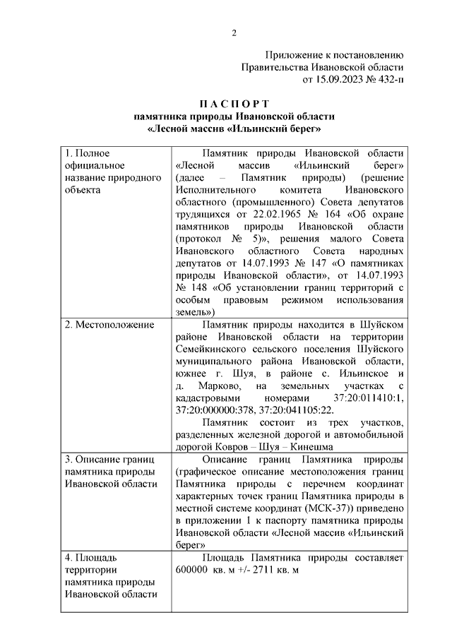 Постановление Правительства Ивановской области от 15.09.2023 N 432-п "О памятнике природы Ивановской области "Лесной массив "Ильинский берег" (вместе с "Паспортом памятника природы Ивановской области "Лесной массив "Ильинский берег")