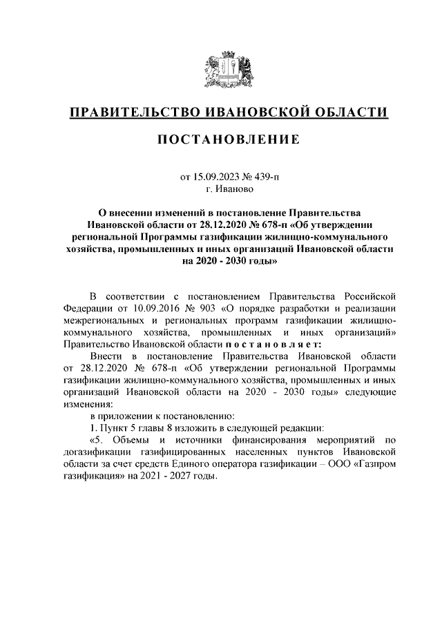 Постановление Правительства Ивановской области от 15.09.2023 N 439-п "О внесении изменений в постановление Правительства Ивановской области от 28.12.2020 N 678-п "Об утверждении региональной Программы газификации жилищно-коммунального хозяйства, промышленных и иных организаций Ивановской области на 2020 - 2030 годы"