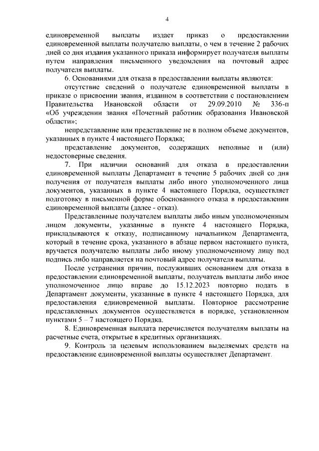 Постановление Правительства Ивановской области от 18.09.2023 N 451-п "О предоставлении единовременной выплаты лицам, удостоенным звания "Почетный работник образования Ивановской области" в 2023 году, и о внесении изменений в постановление Правительства Ивановской области от 29.09.2010 N 336-п "Об учреждении звания "Почетный работник образования Ивановской области" (вместе с "Порядком предоставления единовременной выплаты лицам, удостоенным звания "Почетный работник образования Ивановской области" в 2023 году")