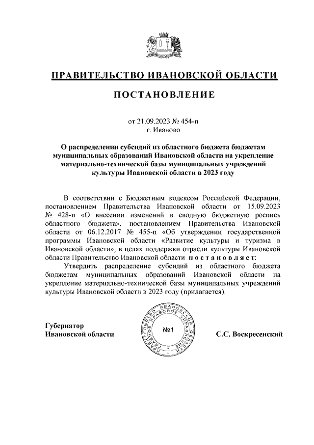 Постановление Правительства Ивановской области от 21.09.2023 N 454-п "О распределении субсидий из областного бюджета бюджетам муниципальных образований Ивановской области на укрепление материально-технической базы муниципальных учреждений культуры Ивановской области в 2023 году"