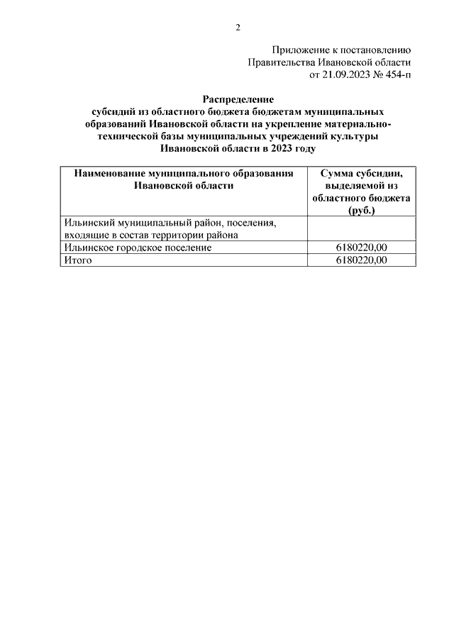 Постановление Правительства Ивановской области от 21.09.2023 N 454-п "О распределении субсидий из областного бюджета бюджетам муниципальных образований Ивановской области на укрепление материально-технической базы муниципальных учреждений культуры Ивановской области в 2023 году"