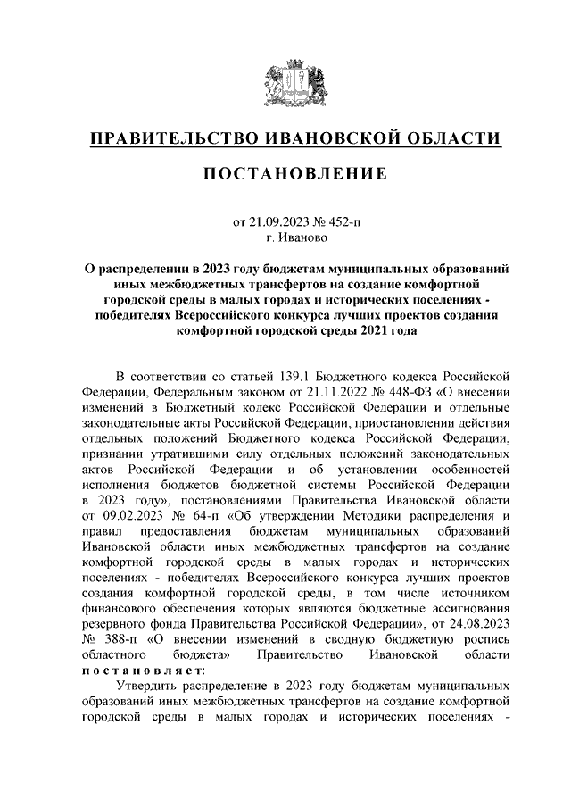 Постановление Правительства Ивановской области от 21.09.2023 N 452-п "О распределении в 2023 году бюджетам муниципальных образований иных межбюджетных трансфертов на создание комфортной городской среды в малых городах и исторических поселениях - победителях Всероссийского конкурса лучших проектов создания комфортной городской среды 2021 года"