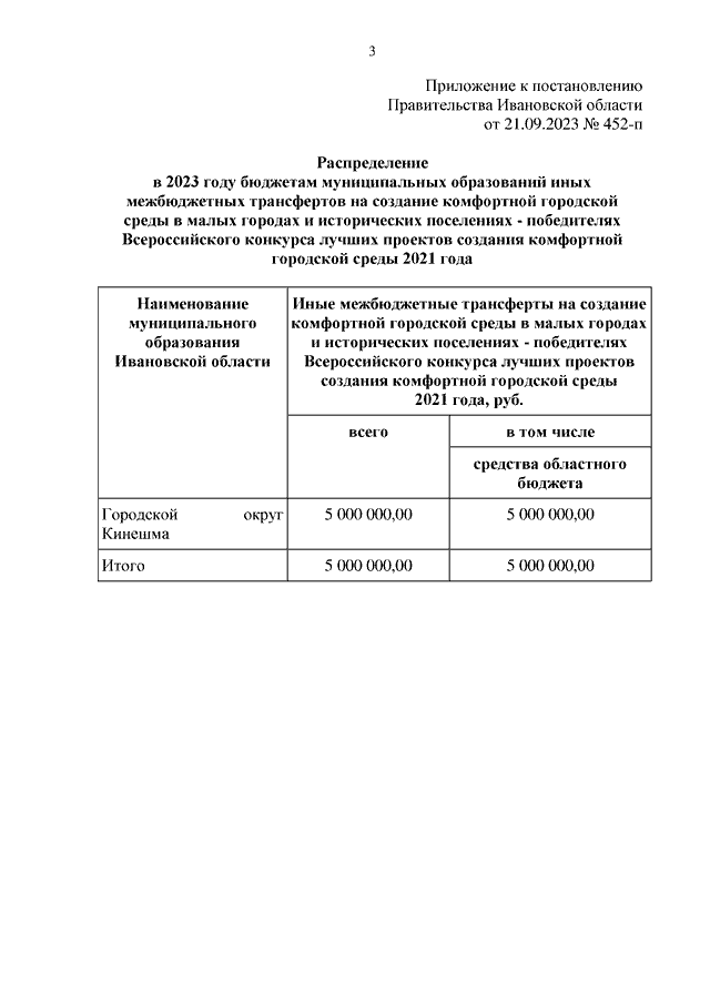 Постановление Правительства Ивановской области от 21.09.2023 N 452-п "О распределении в 2023 году бюджетам муниципальных образований иных межбюджетных трансфертов на создание комфортной городской среды в малых городах и исторических поселениях - победителях Всероссийского конкурса лучших проектов создания комфортной городской среды 2021 года"