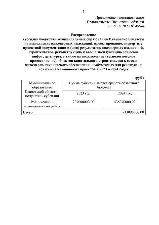 Постановление Правительства Ивановской области от 21.09.2023 N 455-п "О распределении субсидии бюджетам муниципальных образований Ивановской области на выполнение инженерных изысканий, проектирование, экспертизу проектной документации и (или) результатов инженерных изысканий, строительство, реконструкцию и ввод в эксплуатацию объектов инфраструктуры, а также на подключение (технологическое присоединение) объектов капитального строительства к сетям инженерно-технического обеспечения, необходимых для реализации новых инвестиционных проектов в 2023 - 2024 годах"