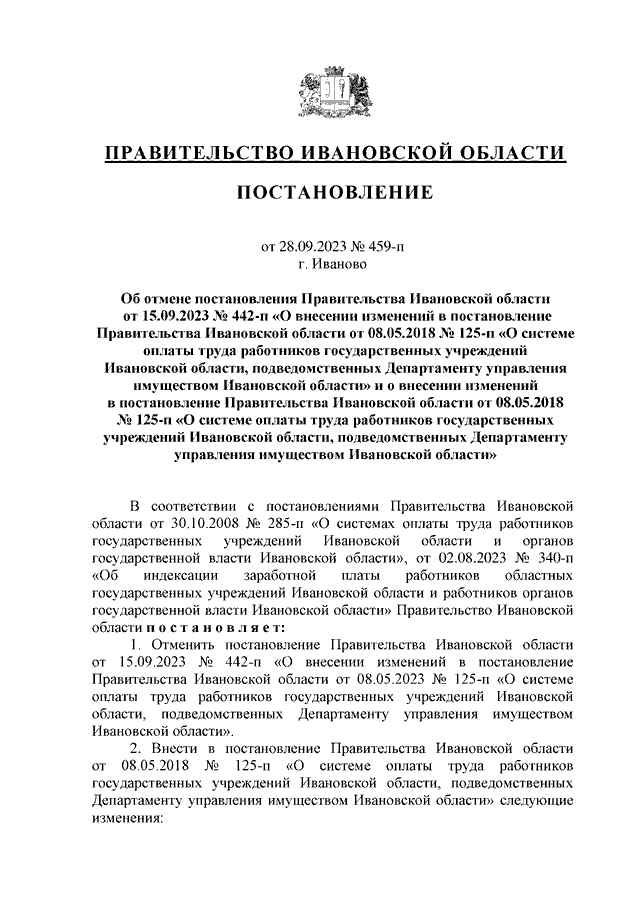 Постановление Правительства Ивановской области от 28.09.2023 N 459-п "Об отмене постановления Правительства Ивановской области от 15.09.2023 N 442-п "О внесении изменений в постановление Правительства Ивановской области от 08.05.2018 N 125-п "О системе оплаты труда работников государственных учреждений Ивановской области, подведомственных Департаменту управления имуществом Ивановской области" и о внесении изменений в постановление Правительства Ивановской области от 08.05.2018 N 125-п "О системе оплаты труда работников государственных учреждений Ивановской области, подведомственных Департаменту управления имуществом Ивановской области"
