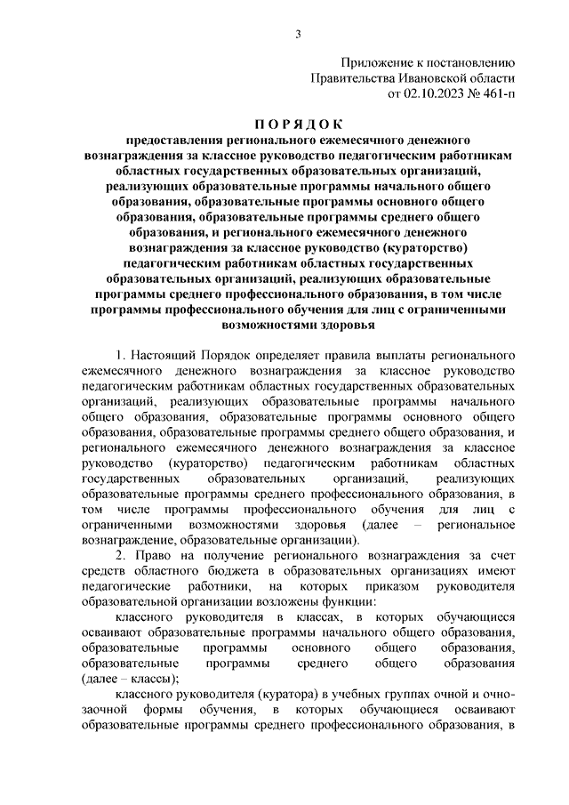 Постановление Правительства Ивановской области от 02.10.2023 N 461-п "Об утверждении Порядка предоставления регионального ежемесячного денежного вознаграждения за классное руководство педагогическим работникам областных государственных образовательных организаций, реализующих образовательные программы начального общего образования, образовательные программы основного общего образования, образовательные программы среднего общего образования, и регионального ежемесячного денежного вознаграждения за классное руководство (кураторство) педагогическим работникам областных государственных образовательных организаций, реализующих образовательные программы среднего профессионального образования, в том числе программы профессионального обучения для лиц с ограниченными возможностями здоровья"