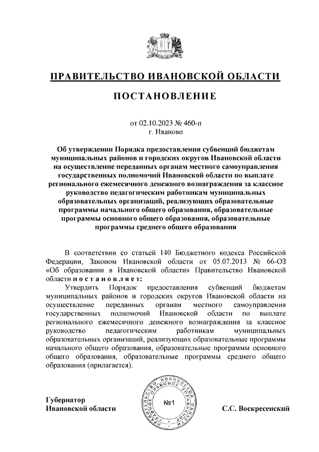 Постановление Правительства Ивановской области от 02.10.2023 N 460-п "Об утверждении Порядка предоставления субвенций бюджетам муниципальных районов и городских округов Ивановской области на осуществление переданных органам местного самоуправления государственных полномочий Ивановской области по выплате регионального ежемесячного денежного вознаграждения за классное руководство педагогическим работникам муниципальных образовательных организаций, реализующих образовательные программы начального общего образования, образовательные программы основного общего образования, образовательные программы среднего общего образования"