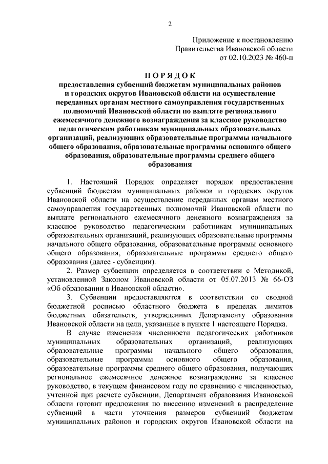Постановление Правительства Ивановской области от 02.10.2023 N 460-п "Об утверждении Порядка предоставления субвенций бюджетам муниципальных районов и городских округов Ивановской области на осуществление переданных органам местного самоуправления государственных полномочий Ивановской области по выплате регионального ежемесячного денежного вознаграждения за классное руководство педагогическим работникам муниципальных образовательных организаций, реализующих образовательные программы начального общего образования, образовательные программы основного общего образования, образовательные программы среднего общего образования"