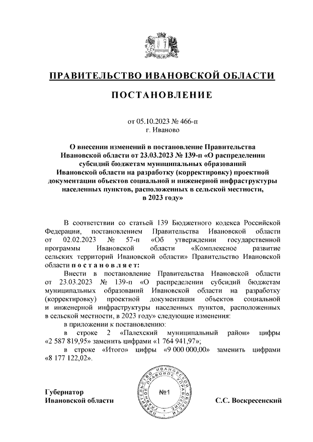 Постановление Правительства Ивановской области от 05.10.2023 N 466-п "О внесении изменений в постановление Правительства Ивановской области от 23.03.2023 N 139-п "О распределении субсидий бюджетам муниципальных образований Ивановской области на разработку (корректировку) проектной документации объектов социальной и инженерной инфраструктуры населенных пунктов, расположенных в сельской местности, в 2023 году"