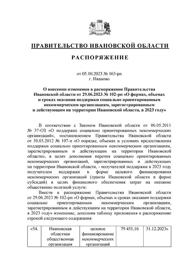 Распоряжение Правительства Ивановской области от 05.10.2023 N 163-рп "О внесении изменения в распоряжение Правительства Ивановской области от 29.06.2023 N 102-рп "О формах, объемах и сроках оказания поддержки социально ориентированным некоммерческим организациям, зарегистрированным и действующим на территории Ивановской области, в 2023 году"