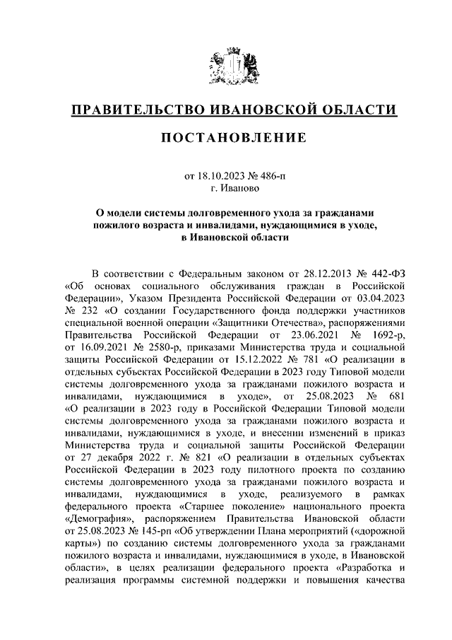 Постановление Правительства Ивановской области от 18.10.2023 N 486-п "О модели системы долговременного ухода за гражданами пожилого возраста и инвалидами, нуждающимися в уходе, в Ивановской области"