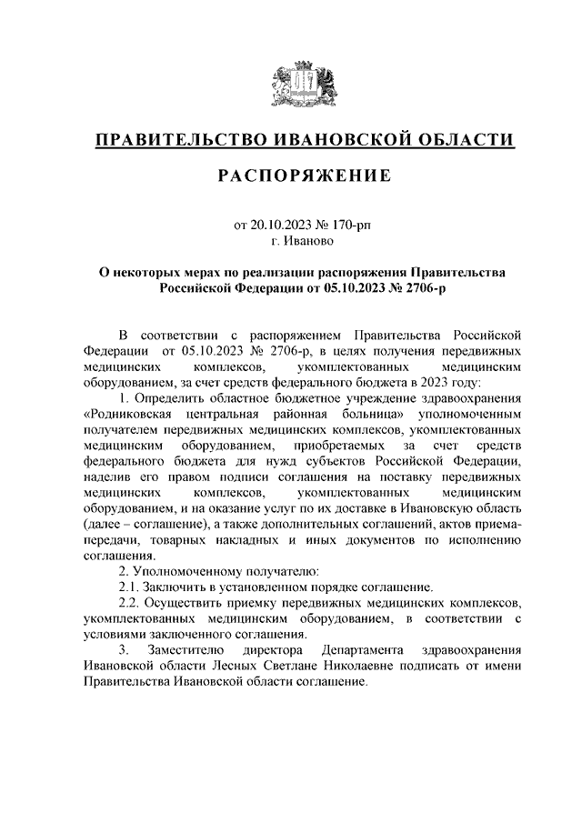 Распоряжение Правительства Ивановской области от 20.10.2023 N 170-рп "О некоторых мерах по реализации распоряжения Правительства Российской Федерации от 05.10.2023 N 2706-р"