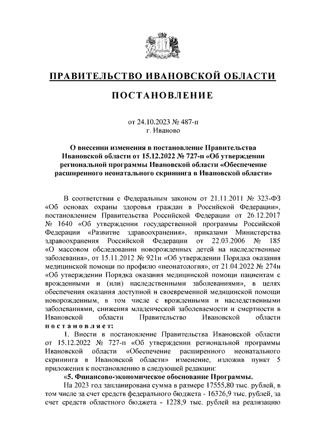 Постановление Правительства Ивановской области от 24.10.2023 N 487-п "О внесении изменения в постановление Правительства Ивановской области от 15.12.2022 N 727-п "Об утверждении региональной программы Ивановской области "Обеспечение расширенного неонатального скрининга в Ивановской области"