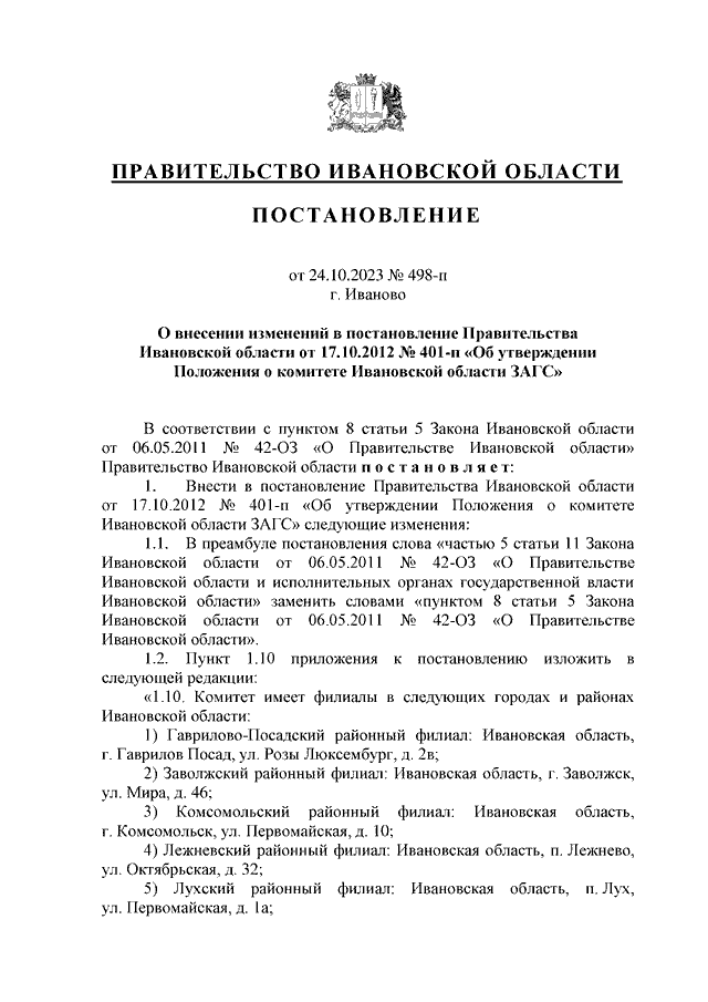 Постановление Правительства Ивановской области от 24.10.2023 N 498-п "О внесении изменений в постановление Правительства Ивановской области от 17.10.2012 N 401-п "Об утверждении Положения о комитете Ивановской области ЗАГС"