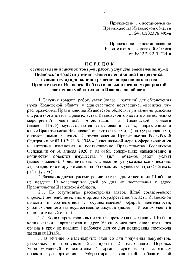 Постановление Правительства Ивановской области от 24.10.2023 N 495-п "О внесении изменений в постановление Правительства Ивановской области от 19.12.2022 N 734-п "Об установлении случая осуществления закупок товаров, работ, услуг у единственного поставщика (подрядчика, исполнителя) для обеспечения нужд Ивановской области и порядке его осуществления" (вместе с "Порядком осуществления закупок товаров, работ, услуг для обеспечения нужд Ивановской области у единственного поставщика (подрядчика, исполнителя) при наличии решения оперативного штаба Правительства Ивановской области по выполнению мероприятий частичной мобилизации в Ивановской области", "Порядком осуществления закупок товаров, работ, услуг для обеспечения нужд Ивановской области у единственного поставщика (подрядчика, исполнителя) при наличии поручения Губернатора Ивановской области об определении единственного подрядчика на выполнение работ по капитальному ремонту объектов здравоохранения Ивановской области")