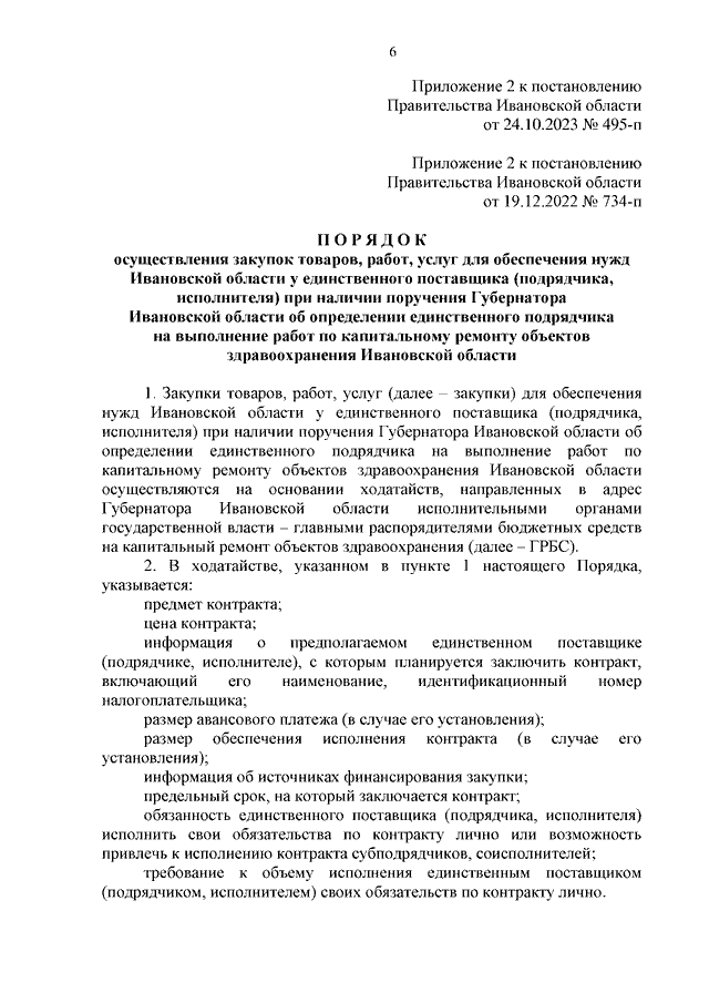 Постановление Правительства Ивановской области от 24.10.2023 N 495-п "О внесении изменений в постановление Правительства Ивановской области от 19.12.2022 N 734-п "Об установлении случая осуществления закупок товаров, работ, услуг у единственного поставщика (подрядчика, исполнителя) для обеспечения нужд Ивановской области и порядке его осуществления" (вместе с "Порядком осуществления закупок товаров, работ, услуг для обеспечения нужд Ивановской области у единственного поставщика (подрядчика, исполнителя) при наличии решения оперативного штаба Правительства Ивановской области по выполнению мероприятий частичной мобилизации в Ивановской области", "Порядком осуществления закупок товаров, работ, услуг для обеспечения нужд Ивановской области у единственного поставщика (подрядчика, исполнителя) при наличии поручения Губернатора Ивановской области об определении единственного подрядчика на выполнение работ по капитальному ремонту объектов здравоохранения Ивановской области")