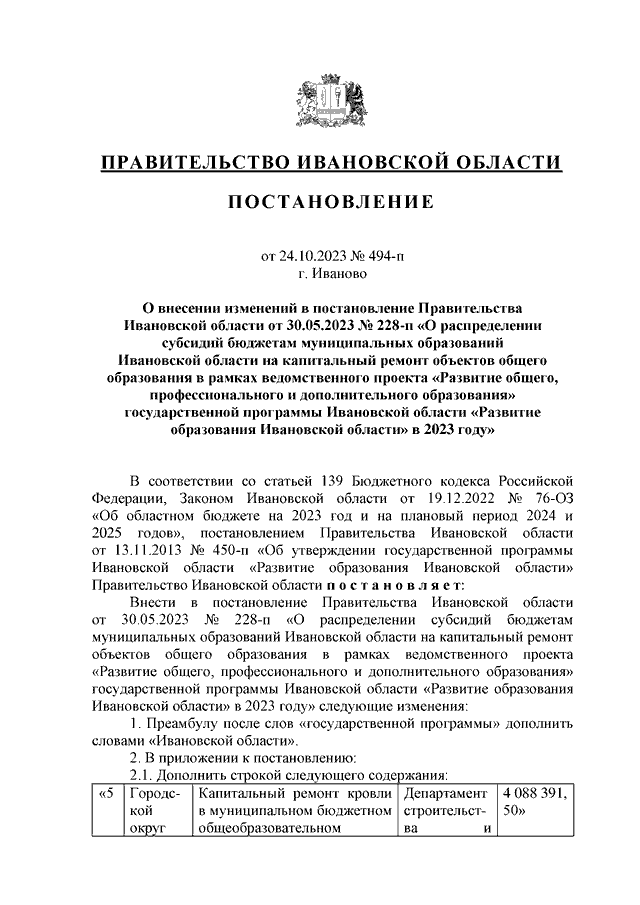Постановление Правительства Ивановской области от 24.10.2023 N 494-п "О внесении изменений в постановление Правительства Ивановской области от 30.05.2023 N 228-п "О распределении субсидий бюджетам муниципальных образований Ивановской области на капитальный ремонт объектов общего образования в рамках ведомственного проекта "Развитие общего, профессионального и дополнительного образования" государственной программы Ивановской области "Развитие образования Ивановской области" в 2023 году"