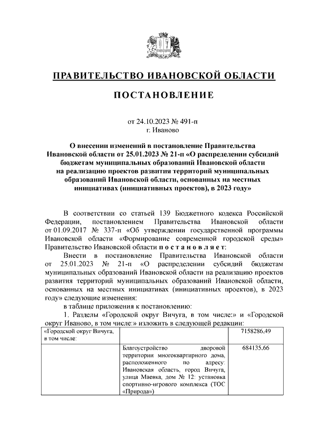 Постановление Правительства Ивановской области от 24.10.2023 N 491-п "О внесении изменений в постановление Правительства Ивановской области от 25.01.2023 N 21-п "О распределении субсидий бюджетам муниципальных образований Ивановской области на реализацию проектов развития территорий муниципальных образований Ивановской области, основанных на местных инициативах (инициативных проектов), в 2023 году"