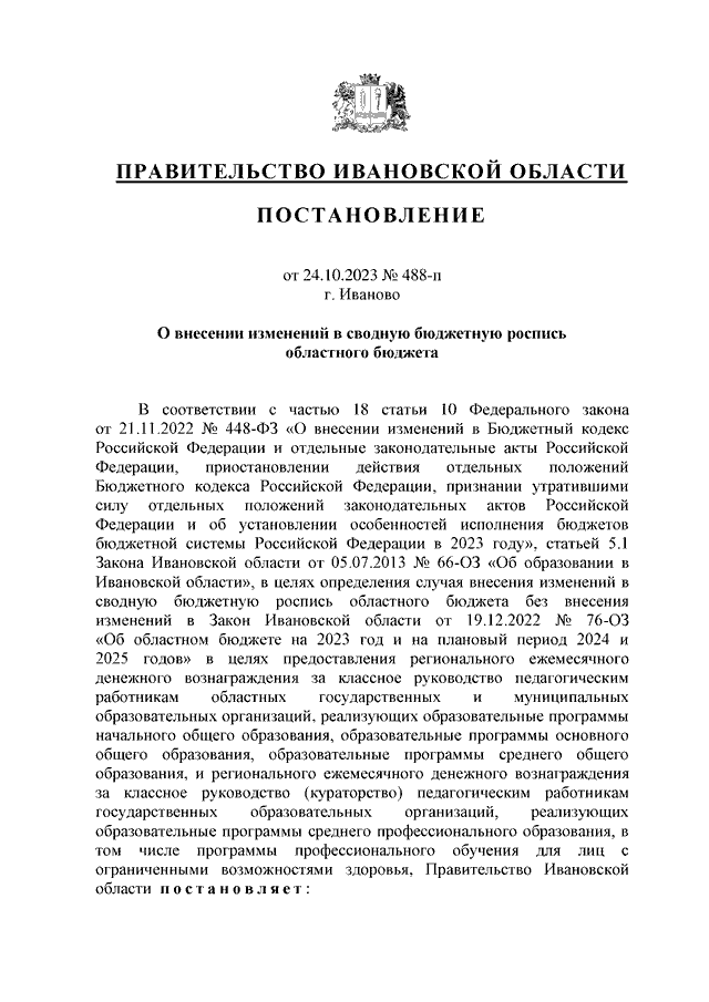 Постановление Правительства Ивановской области от 24.10.2023 N 488-п "О внесении изменений в сводную бюджетную роспись областного бюджета"