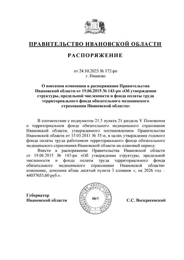 Распоряжение Правительства Ивановской области от 24.10.2023 N 172-рп "О внесении изменения в распоряжение Правительства Ивановской области от 19.06.2015 N 143-рп "Об утверждении структуры, предельной численности и фонда оплаты труда территориального фонда обязательного медицинского страхования Ивановской области"