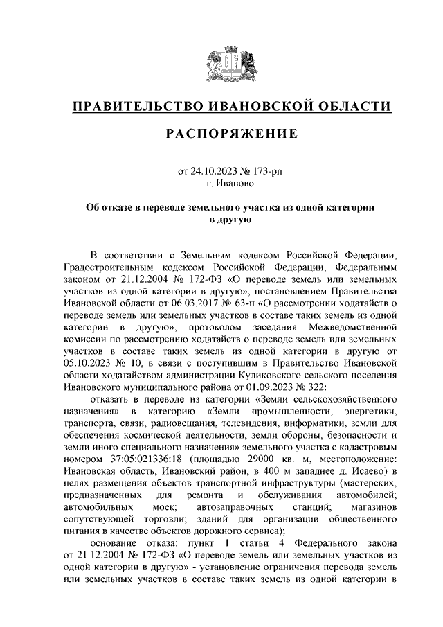 Распоряжение Правительства Ивановской области от 24.10.2023 N 173-рп "Об отказе в переводе земельного участка из одной категории в другую"
