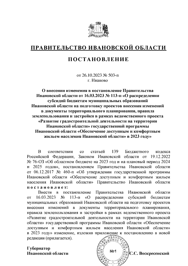 Постановление Правительства Ивановской области от 26.10.2023 N 503-п "О внесении изменения в постановление Правительства Ивановской области от 16.03.2023 N 113-п "О распределении субсидий бюджетам муниципальных образований Ивановской области на подготовку проектов внесения изменений в документы территориального планирования, правила землепользования и застройки в рамках ведомственного проекта "Развитие градостроительной деятельности на территории Ивановской области" государственной программы Ивановской области "Обеспечение доступным и комфортным жильем населения Ивановской области" в 2023 году"