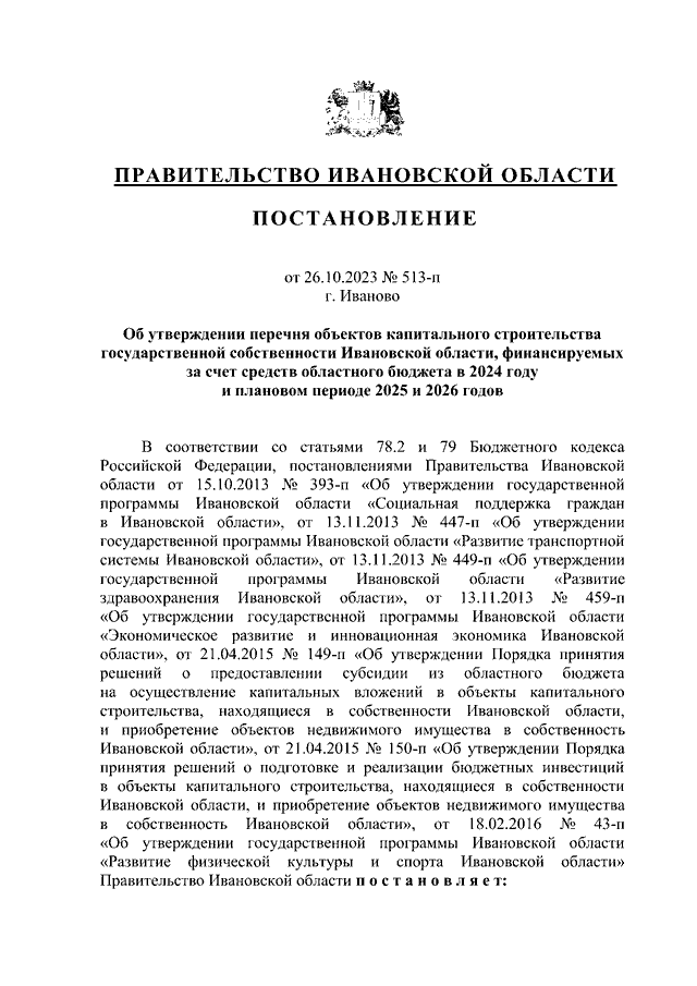 Постановление Правительства Ивановской области от 26.10.2023 N 513-п "Об утверждении перечня объектов капитального строительства государственной собственности Ивановской области, финансируемых за счет средств областного бюджета в 2024 году и плановом периоде 2025 и 2026 годов"