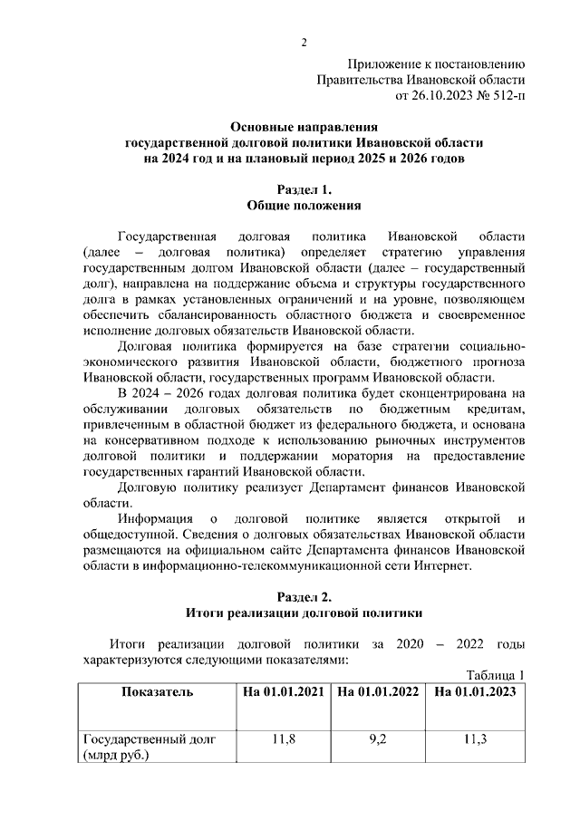 Постановление Правительства Ивановской области от 26.10.2023 N 512-п "Об утверждении основных направлений государственной долговой политики Ивановской области на 2024 год и на плановый период 2025 и 2026 годов"