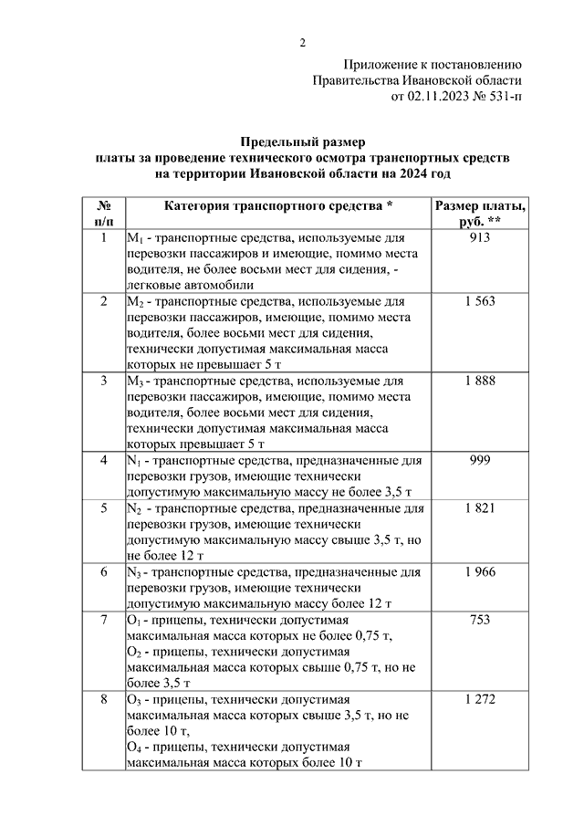 Постановление Правительства Ивановской области от 02.11.2023 N 531-п "Об установлении предельного размера платы за проведение технического осмотра транспортных средств на территории Ивановской области на 2024 год"