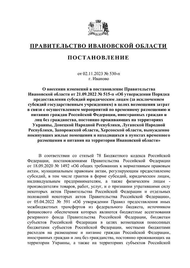 Постановление Правительства Ивановской области от 02.11.2023 N 530-п "О внесении изменений в постановление Правительства Ивановской области от 21.09.2022 N 515-п "Об утверждении Порядка предоставления субсидий юридическим лицам (за исключением субсидий государственным учреждениям) в целях возмещения затрат в связи с осуществлением мероприятий по временному размещению и питанию граждан Российской Федерации, иностранных граждан и лиц без гражданства, постоянно проживающих на территориях Украины, Донецкой Народной Республики, Луганской Народной Республики, Запорожской области, Херсонской области, вынужденно покинувших жилые помещения и находящихся в пунктах временного размещения и питания на территории Ивановской области"