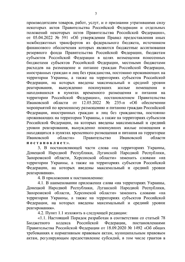 Постановление Правительства Ивановской области от 02.11.2023 N 530-п "О внесении изменений в постановление Правительства Ивановской области от 21.09.2022 N 515-п "Об утверждении Порядка предоставления субсидий юридическим лицам (за исключением субсидий государственным учреждениям) в целях возмещения затрат в связи с осуществлением мероприятий по временному размещению и питанию граждан Российской Федерации, иностранных граждан и лиц без гражданства, постоянно проживающих на территориях Украины, Донецкой Народной Республики, Луганской Народной Республики, Запорожской области, Херсонской области, вынужденно покинувших жилые помещения и находящихся в пунктах временного размещения и питания на территории Ивановской области"