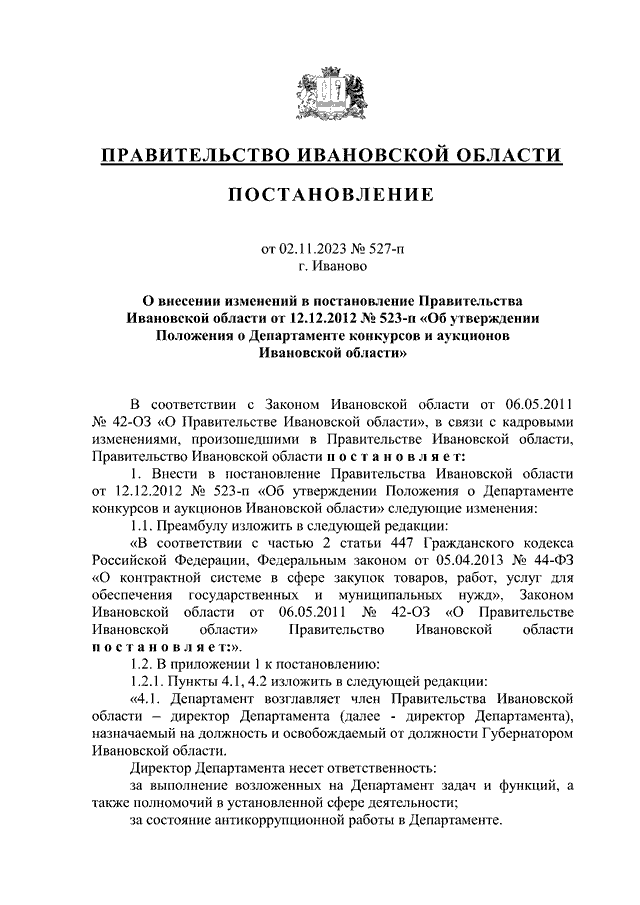Постановление Правительства Ивановской области от 02.11.2023 N 527-п "О внесении изменений в постановление Правительства Ивановской области от 12.12.2012 N 523-п "Об утверждении Положения о Департаменте конкурсов и аукционов Ивановской области"