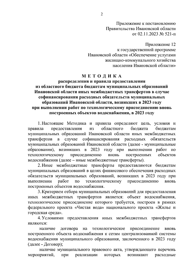 Постановление Правительства Ивановской области от 02.11.2023 N 521-п "Об установлении расходного обязательства и внесении изменения в постановление Правительства Ивановской области от 06.12.2017 N 458-п "Об утверждении государственной программы Ивановской области "Обеспечение услугами жилищно-коммунального хозяйства населения Ивановской области" (вместе с "Методикой распределения и правилами предоставления из областного бюджета бюджетам муниципальных образований Ивановской области иных межбюджетных трансфертов в случае софинансирования расходных обязательств муниципальных образований Ивановской области, возникших в 2023 году при выполнении работ по технологическому присоединению вновь построенных объектов водоснабжения, в 2023 году")