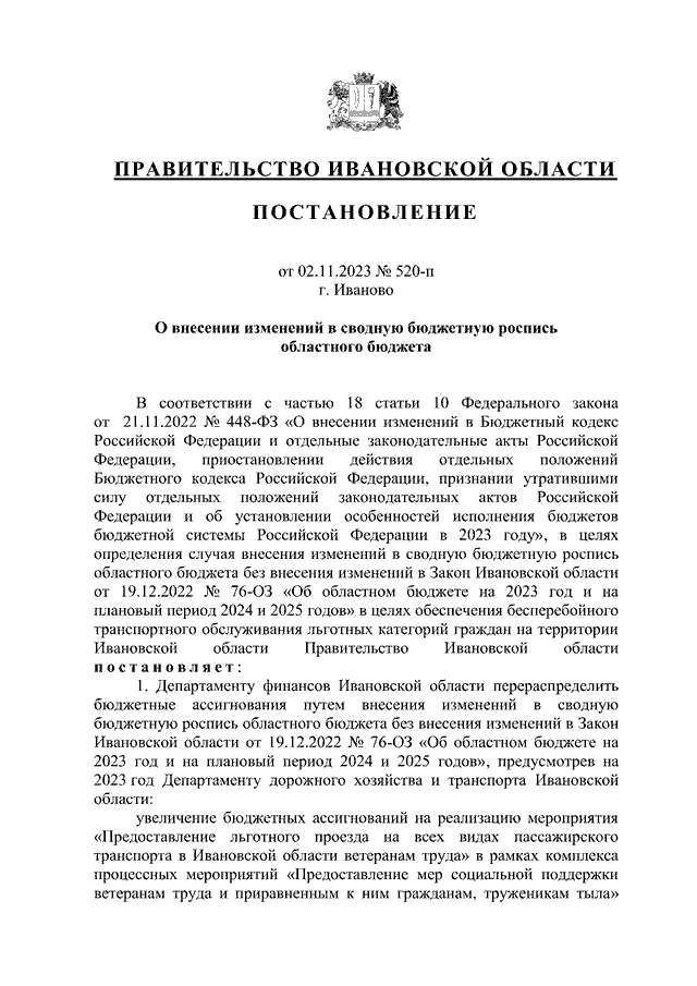 Постановление Правительства Ивановской области от 02.11.2023 N 520-п "О внесении изменений в сводную бюджетную роспись областного бюджета"