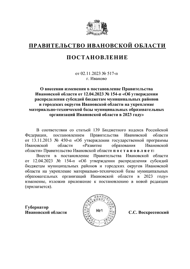 Постановление Правительства Ивановской области от 02.11.2023 N 517-п "О внесении изменения в постановление Правительства Ивановской области от 12.04.2023 N 154-п "Об утверждении распределения субсидий бюджетам муниципальных районов и городских округов Ивановской области на укрепление материально-технической базы муниципальных образовательных организаций Ивановской области в 2023 году"
