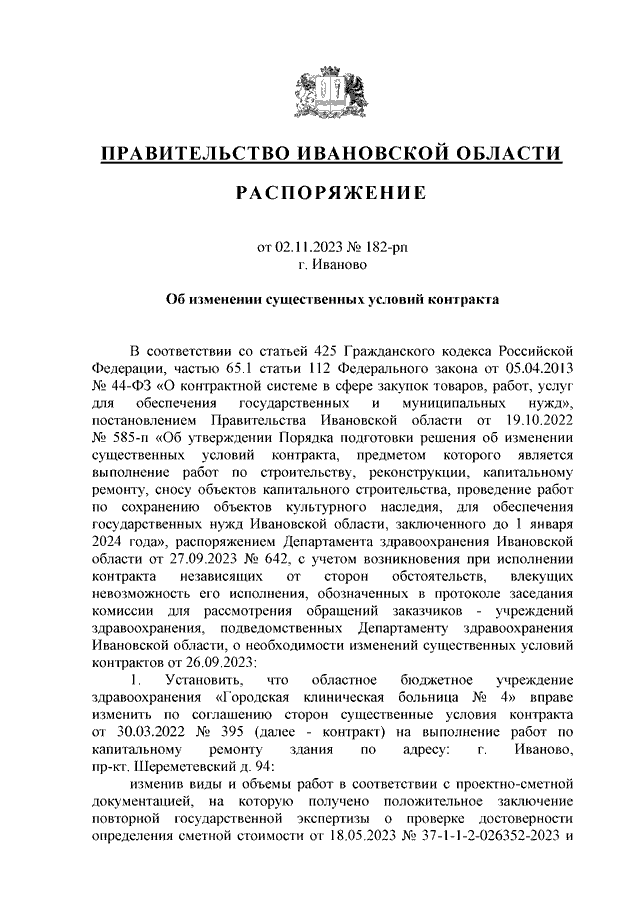 Распоряжение Правительства Ивановской области от 02.11.2023 N 182-рп "Об изменении существенных условий контракта"