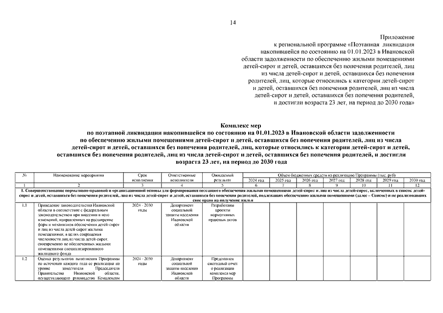 Распоряжение Правительства Ивановской области от 02.11.2023 N 184-рп "Об утверждении региональной программы "Поэтапная ликвидация накопившейся по состоянию на 01.01.2023 в Ивановской области задолженности по обеспечению жилыми помещениями детей-сирот и детей, оставшихся без попечения родителей, лиц из числа детей-сирот и детей, оставшихся без попечения родителей, лиц, которые относились к категории детей-сирот и детей, оставшихся без попечения родителей, лиц из числа детей-сирот и детей, оставшихся без попечения родителей, и достигли возраста 23 лет, на период до 2030 года"