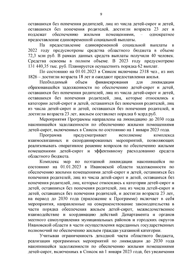Распоряжение Правительства Ивановской области от 02.11.2023 N 184-рп "Об утверждении региональной программы "Поэтапная ликвидация накопившейся по состоянию на 01.01.2023 в Ивановской области задолженности по обеспечению жилыми помещениями детей-сирот и детей, оставшихся без попечения родителей, лиц из числа детей-сирот и детей, оставшихся без попечения родителей, лиц, которые относились к категории детей-сирот и детей, оставшихся без попечения родителей, лиц из числа детей-сирот и детей, оставшихся без попечения родителей, и достигли возраста 23 лет, на период до 2030 года"
