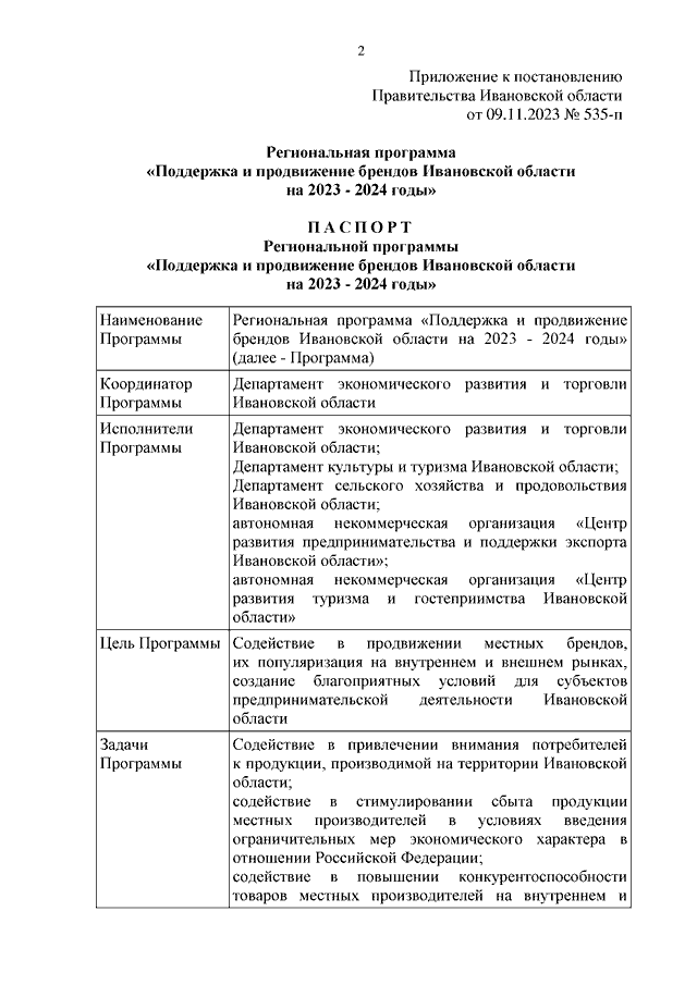 Постановление Правительства Ивановской области от 09.11.2023 N 535-п "Об утверждении Региональной программы "Поддержка и продвижение брендов Ивановской области на 2023 - 2024 годы"