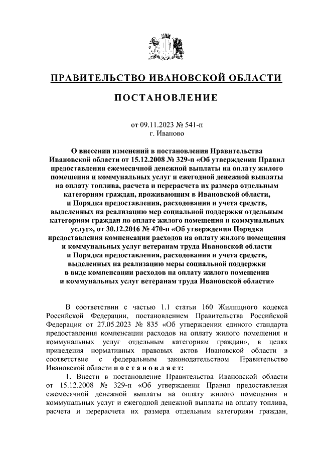 Постановление Правительства Ивановской области от 09.11.2023 N 541-п "О внесении изменений в постановления Правительства Ивановской области от 15.12.2008 N 329-п "Об утверждении Правил предоставления ежемесячной денежной выплаты на оплату жилого помещения и коммунальных услуг и ежегодной денежной выплаты на оплату топлива, расчета и перерасчета их размера отдельным категориям граждан, проживающим в Ивановской области, и Порядка предоставления, расходования и учета средств, выделенных на реализацию мер социальной поддержки отдельным категориям граждан по оплате жилого помещения и коммунальных услуг", от 30.12.2016 N 470-п "Об утверждении Порядка предоставления компенсации расходов на оплату жилого помещения и коммунальных услуг ветеранам труда Ивановской области и Порядка предоставления, расходования и учета средств, выделенных на реализацию меры социальной поддержки в виде компенсации расходов на оплату жилого помещения и коммунальных услуг ветеранам труда Ивановской области"