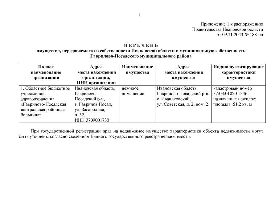Распоряжение Правительства Ивановской области от 09.11.2023 N 188-рп "О передаче имущества из собственности Ивановской области в муниципальную собственность муниципальных образований Ивановской области" (вместе с "Перечнем имущества, передаваемого из собственности Ивановской области в муниципальную собственность Гаврилово-Посадского муниципального района", "Перечнем имущества, передаваемого из собственности Ивановской области в муниципальную собственность Заволжского муниципального района")
