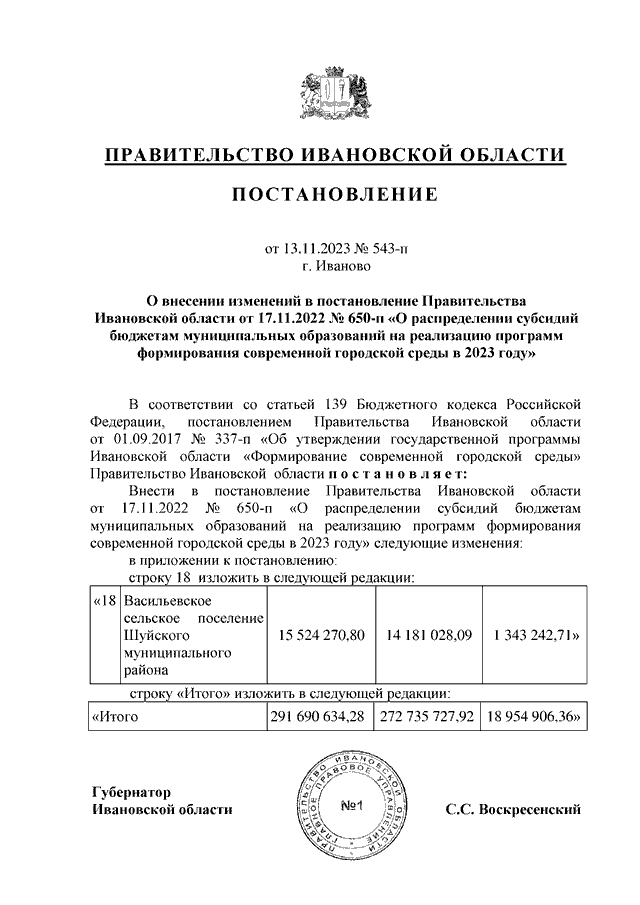 Постановление Правительства Ивановской области от 13.11.2023 N 543-п "О внесении изменений в постановление Правительства Ивановской области от 17.11.2022 N 650-п "О распределении субсидий бюджетам муниципальных образований на реализацию программ формирования современной городской среды в 2023 году"