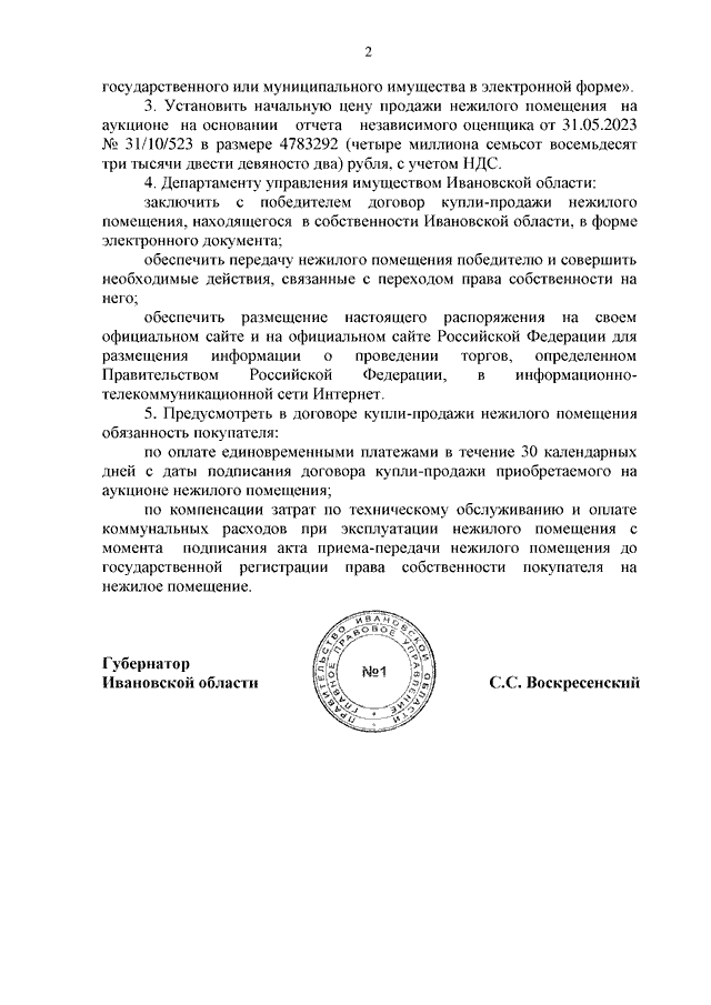 Распоряжение Правительства Ивановской области от 13.11.2023 N 189-рп "Об условиях приватизации нежилого помещения по адресу: Ивановская область, г. Иваново, местечко Минеево, КРАНЭКС, дом 22, пом. 1 - 24, 29 - 55, находящегося в собственности Ивановской области"