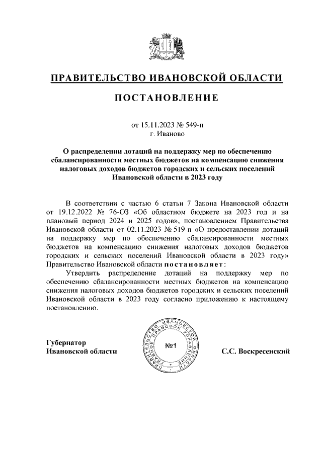 Постановление Правительства Ивановской области от 15.11.2023 N 549-п "О распределении дотаций на поддержку мер по обеспечению сбалансированности местных бюджетов на компенсацию снижения налоговых доходов бюджетов городских и сельских поселений Ивановской области в 2023 году"