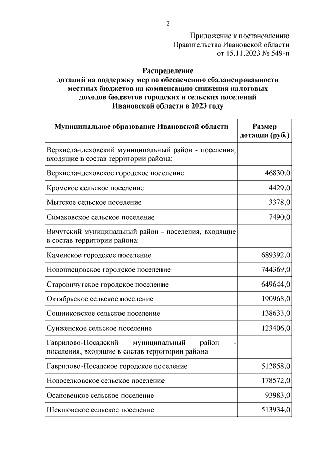 Постановление Правительства Ивановской области от 15.11.2023 N 549-п "О распределении дотаций на поддержку мер по обеспечению сбалансированности местных бюджетов на компенсацию снижения налоговых доходов бюджетов городских и сельских поселений Ивановской области в 2023 году"