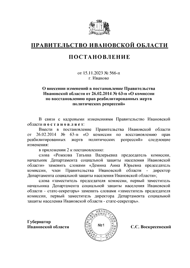 Постановление Правительства Ивановской области от 15.11.2023 N 566-п "О внесении изменений в постановление Правительства Ивановской области от 26.02.2014 N 63-п "О комиссии по восстановлению прав реабилитированных жертв политических репрессий"